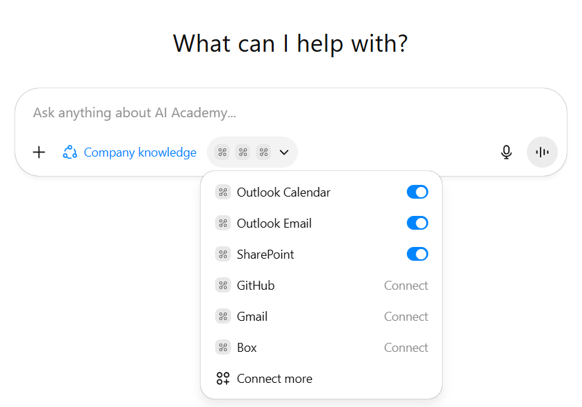 Feature conflicts: Can't use web search or generate images while Company Knowledge is active. Turn it off to access these (you'll keep your conversation context).