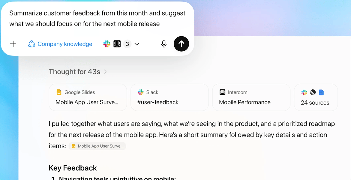 Company Knowledge understands your work context immediately, helping with drafting plans, compiling reports, or catching up on projects. Here are some examples: