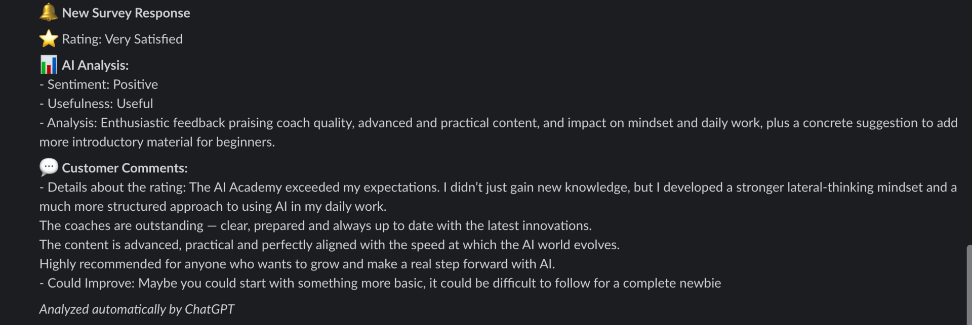 The Slack notification gives your team everything they need at a glance: the original response, ChatGPT's classification, and a quick explanation. No need to open spreadsheets or dig through raw data.