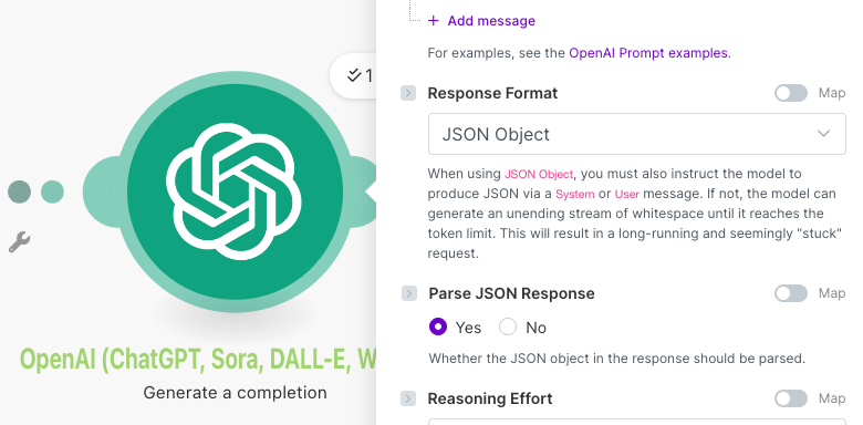 Don’t forget to select JSON Object as response format and select Yes to parse JSON directly in the OpenAI module. You can find these settings under “Advanced settings”