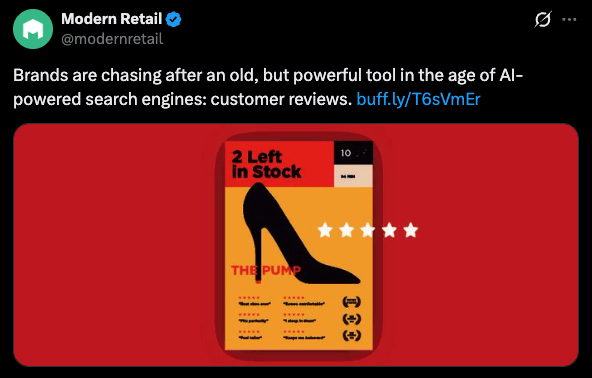 AI platforms like ChatGPT and Perplexity are reshaping product discovery, using customer reviews as a key input for recommendations. ChatGPT alone receives over 84 million shopping-related queries weekly in the US. Brands are responding by actively collecting more reviews across public platforms like Reddit and Yelp, offering incentives to customers, and treating reviews as a core part of their visibility strategy.