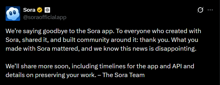 OpenAI is shutting down Sora as a social media platform, though the underlying video generation model will remain accessible. The app, which launched as a creative video space before adding likes and comments later, never managed to attract a significant user base. The model itself stays available via API.