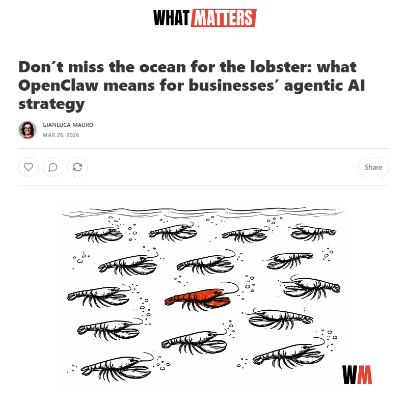 Our founder Gianluca Mauro just published his latest article, “Don’t miss the ocean for the lobster: what OpenClaw means for businesses’ agentic AI strategy”. Read it here.