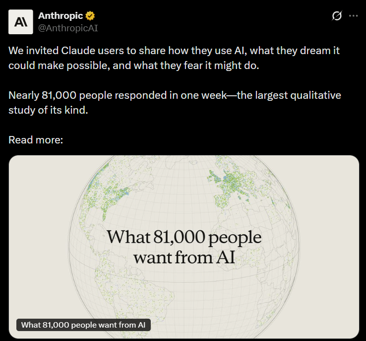 Anthropic surveyed 80,000 people across 159 countries and 70 languages, using an AI interviewer, to understand how people relate to AI. The top hope was professional support, freeing people to focus on more meaningful work. The top fears were unreliability and hallucinations, followed by job displacement and loss of human autonomy. Sentiment also split sharply by region, with developed countries more skeptical and emerging economies significantly more optimistic.