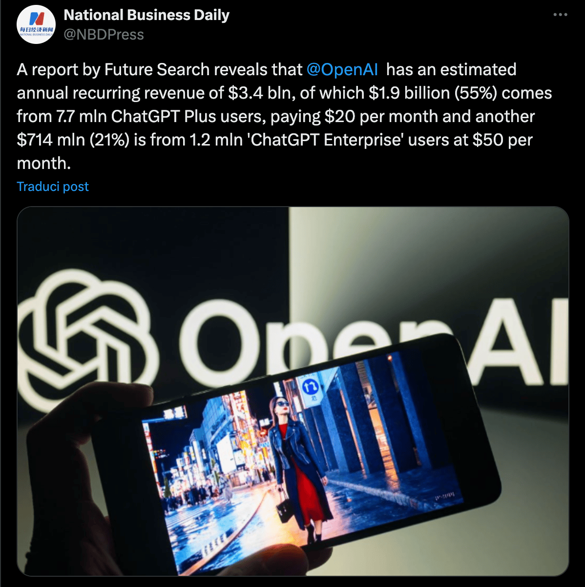 A report from Future Search estimates OpenAI's revenue sources. Individual ChatGPT Plus subscriptions lead at $1.9B, followed by ChatGPT Enterprise at $714M. API usage brings in $510M, while Teams accounts contribute $290M. This breakdown reveals ChatGPT Plus as the dominant income stream, significantly outpacing API revenue.
