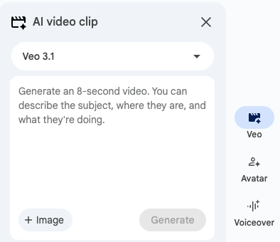 You also have the option to click "+ Image" at the bottom of the prompt box to upload an image that Veo will animate into an 8-second video. This is useful if you want to bring a specific product photo, logo, or subject to life.