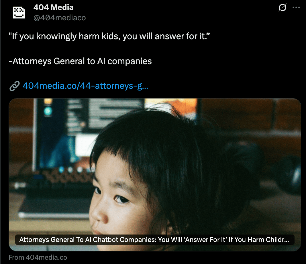 Forty-four U.S. attorneys general warned major AI companies this week they'll "answer for it" if they harm children, citing reports of Meta's chatbots engaging in sexual conversations with minors. Meanwhile, OpenAI admitted their safety systems fail during long ChatGPT conversations, as users increasingly seek mental health support through the platform. Both stories highlight how AI adoption has outpaced safety measures for vulnerable users.