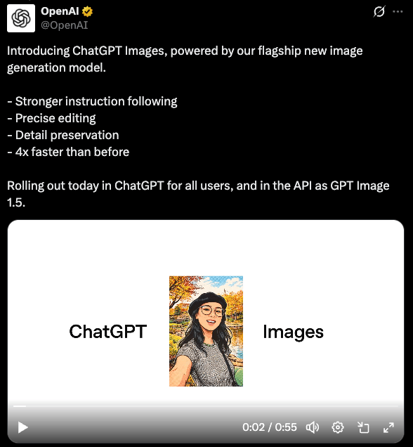 OpenAI released GPT Image 1.5 with 4x faster generation and better editing precision, plus a new dedicated Images feature in ChatGPT. Separately, Disney signed a three-year deal giving OpenAI exclusive access to 200+ characters for video (and probably image) generation, but only for one year, after which Disney can partner with other AI companies.