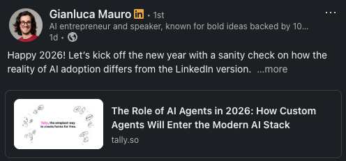 As mentioned above, Gianluca shared his thoughts on LinkedIn about how 2025 was "the year of agents" on LinkedIn while most companies weren't actually ready to adopt them, and how that will change for some in 2026.
