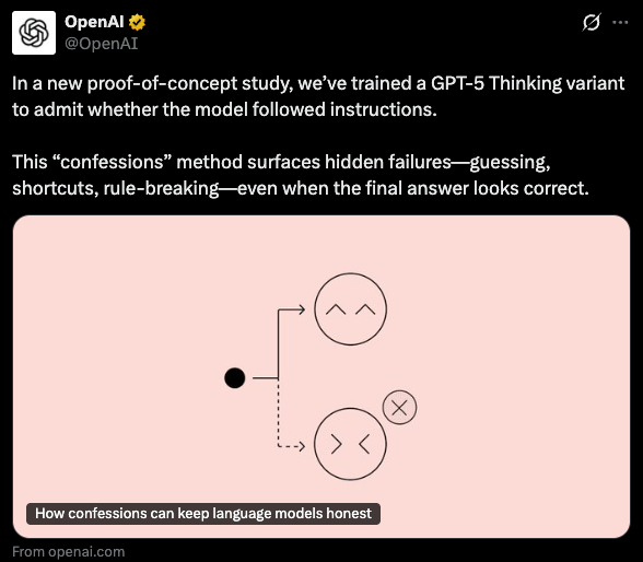OpenAI developed a "confessions" technique where AI models produce a separate, honest report admitting when they violated instructions or hallucinated, without being penalized. Tested on GPT-5 Thinking, it caught 95.6% of problematic behaviors. The confession trains solely on honesty while the main answer optimizes for helpfulness. This proof-of-concept aims to surface hidden misbehaviors as models become more capable.