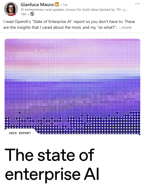 Gianluca’s latest LinkedIn post breaks down OpenAI’s enterprise report, highlighting that companies see real ROI only when teams are well-trained, build custom automations, and embed AI deeply into workflows.
