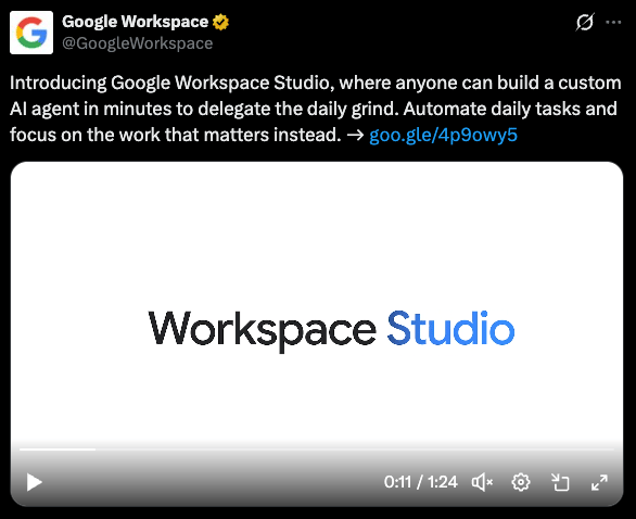 Google released Workspace Studio, promising anyone can build AI agents without coding. Using Gemini 3, employees can supposedly automate tasks from simple email sorting to complex workflows by describing what they want in natural language. Agents integrate with Gmail, Drive, Chat, and external tools like Asana and Salesforce. Rolling out to business customers over the next few weeks.