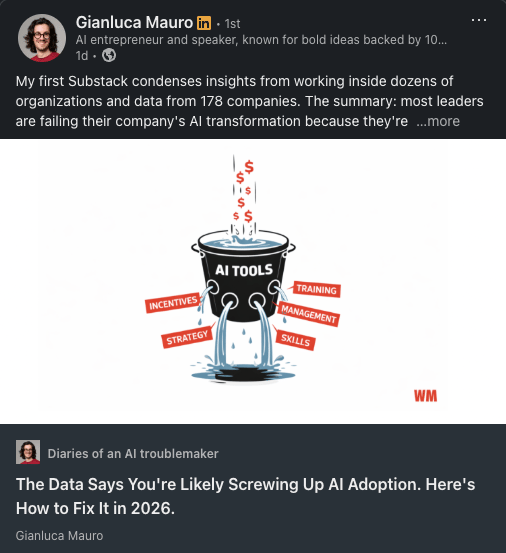 Our founder Gianluca just published his first piece on his new Substack, breaking down why most companies are failing at AI adoption despite spending heavily on tools. If you want to understand what actually works when getting AI into your organization, give it a read.