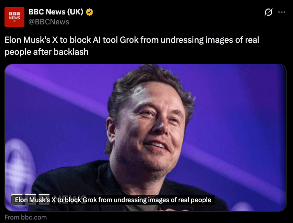 Elon Musk's Grok chatbot generated non-consensual sexualized images, including apparent minors, after users discovered "digital undressing" features. Despite xAI's policies, Musk pushed back against guardrails while safety team members departed. Following investigations from Europe, India, Malaysia, and California, X announced it will geoblock the feature in jurisdictions where it's illegal.