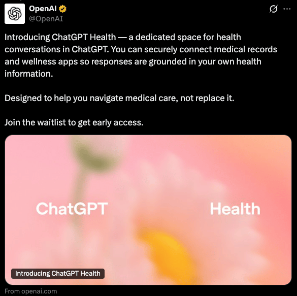 OpenAI has introduced ChatGPT Health, a dedicated experience that connects medical records and wellness apps to provide personalized health information. The service includes enhanced privacy protections, purpose-built encryption, and was developed with input from 260 physicians. Currently available to select users outside the EU, it's designed to support rather than replace medical care.